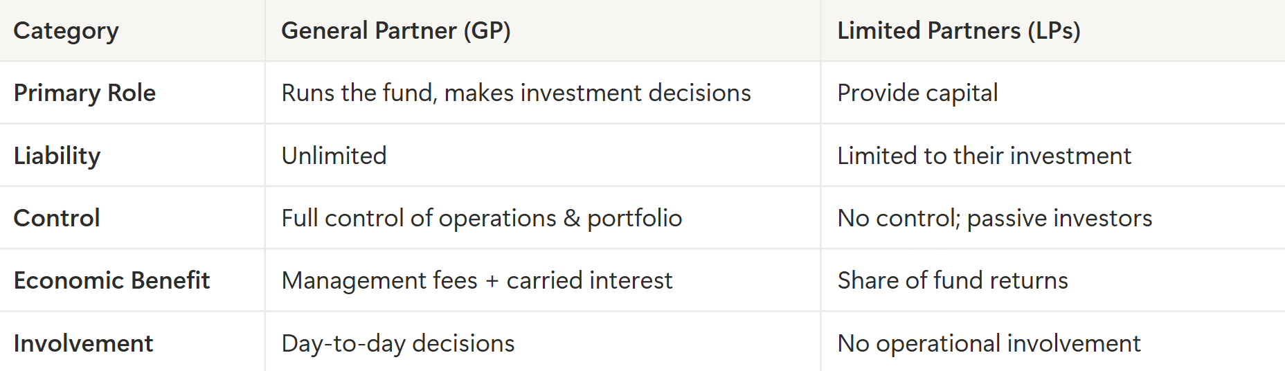 This structure defines who controls the fund, who provides the capital, and who takes on liability.