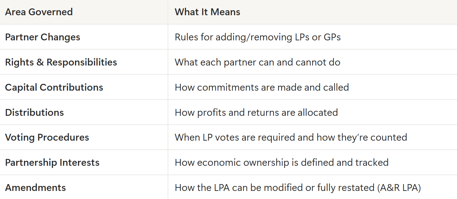 Every partnership operates under a Limited Partnership Agreement (LPA) — essentially, the contract that governs how the fund works.
