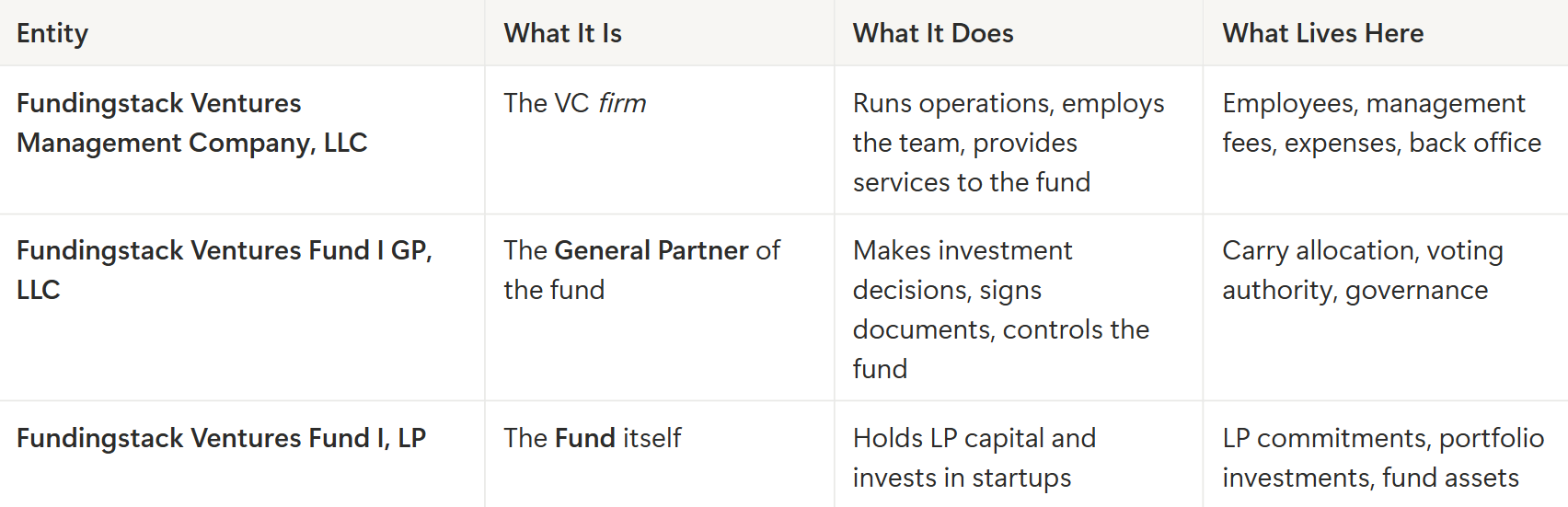 To run Fund I, Fundingstack Ventures forms a second LLC: Fundingstack Ventures Fund I GP, LLC. This entity acts as the general partner of the fund. Its job is to control and manage the fund — and to take on the liability that LPs don’t.