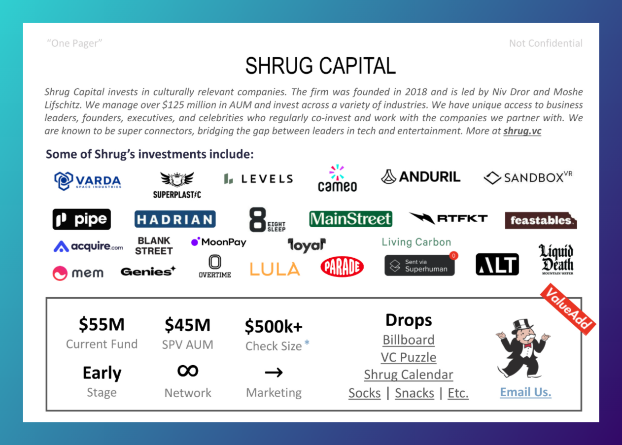 What we like: The deck does a great job of showcasing Shrug Capital’s strong track record and founder credibility without overloading on details. It’s clean, to the point, and makes it easy to see why their investment approach makes sense. Side note: it also has a sense of humor :)