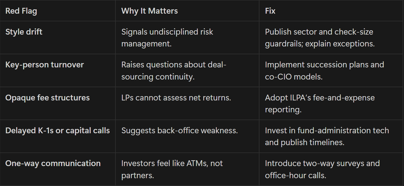 Industry bodies such as the Chartered Alternative Investment Analyst Association (CAIA) and the Institutional Limited Partners Association (ILPA) give LPs a clear playbook for spotting trouble. CAIA’s “Red Flags in Private-Markets Due Diligence” series warns that cues like style drift, unexpected key-person turnover, and chronically late reporting often precede both underperformance and operational failures, while ILPA’s updated Due Diligence Questionnaire pushes allocators to probe fee transparency, valuation controls, and emerging ESG metrics.